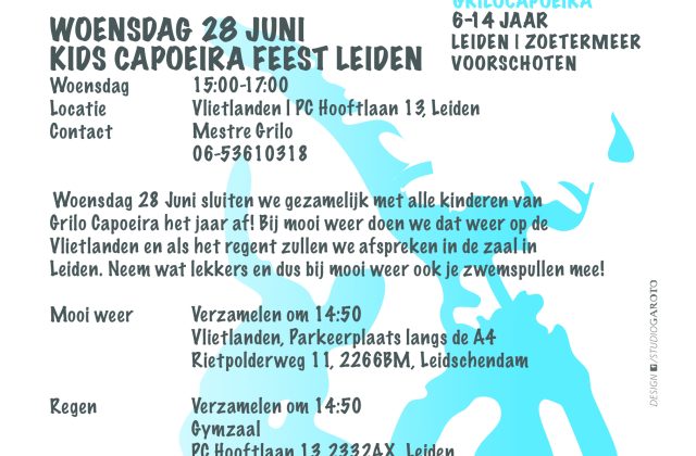 Op woensdag 28 juni vindt er weer een Grilo Capoeira Kidsroda plaats ter afsluiting van het seizoen. Datum: 28 juni Tijd: 15.00 – 17.00 uur Locatie (bij goed weer): Om 14.50 uur verzamelen bij Vlietlanden, Parkeerplaats langs de A4, Rietpolderweg 11, 2266 BM Leidschendam Locatie (bij regen): Om 14.50 uur verzamelen bij Gymzaal van Grilo Capoeira Leiden, P.C. Hooftlaan […]